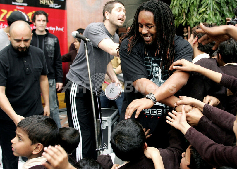 【ニューデリー/インド 14日 AFP】グラミー賞(Grammy Awards)受賞ラテン・ヒップホップ・グループ、オゾマトリ(Ozomatli)が13日、Arya Anathalaya孤児院を訪し、コンサートを開催した。ロサンゼルスを拠点にする同グループは米国の文化大使として、11日から21日までインド&ネパールで無料コンサート・ツアーを行う。写真は子供たちを前にパフォーマンスを披露する同グループ。(c)AFP/MANAN VATSYAYANA