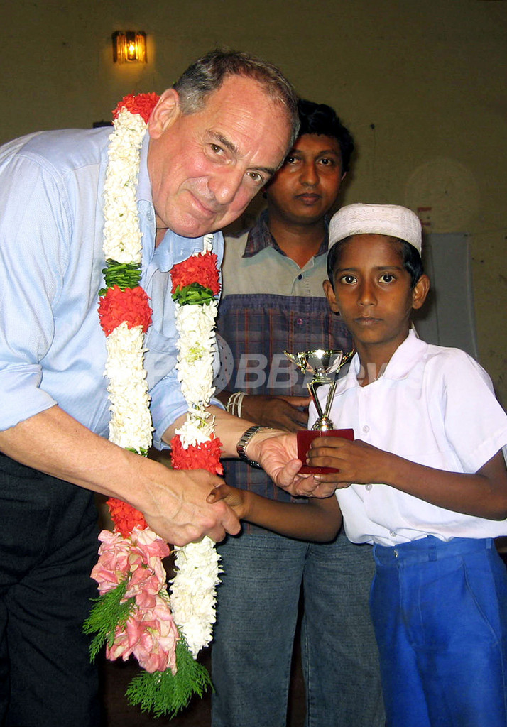 【アンパラ/スリランカ 14日 AFP】キム・ハウエルズ(Kim Howells)英外務連邦相は14日、東部アンパラ(Ampara)県を訪問した。同相は、スリランカ国内に残る英国植民地時代の事業評価を行うため、13日から3日間の日程で同国を訪問中。ハウエルズ外務連邦相は行程2日目となる14日、国内紛争で家を追われた子どもたちによる、平和への祈りを込めた絵画コンクールに出席し、受賞者に賞を授与した。同相は政府高官、外交関係者および行政担当者との各種協議を行った後、15日に帰国する予定。写真は同日、アンパラ県の学校で絵画コンクールの受賞者の少年に優勝杯を授与するハウエルズ外務連邦相。(c)AFP/C. PATABADIGE