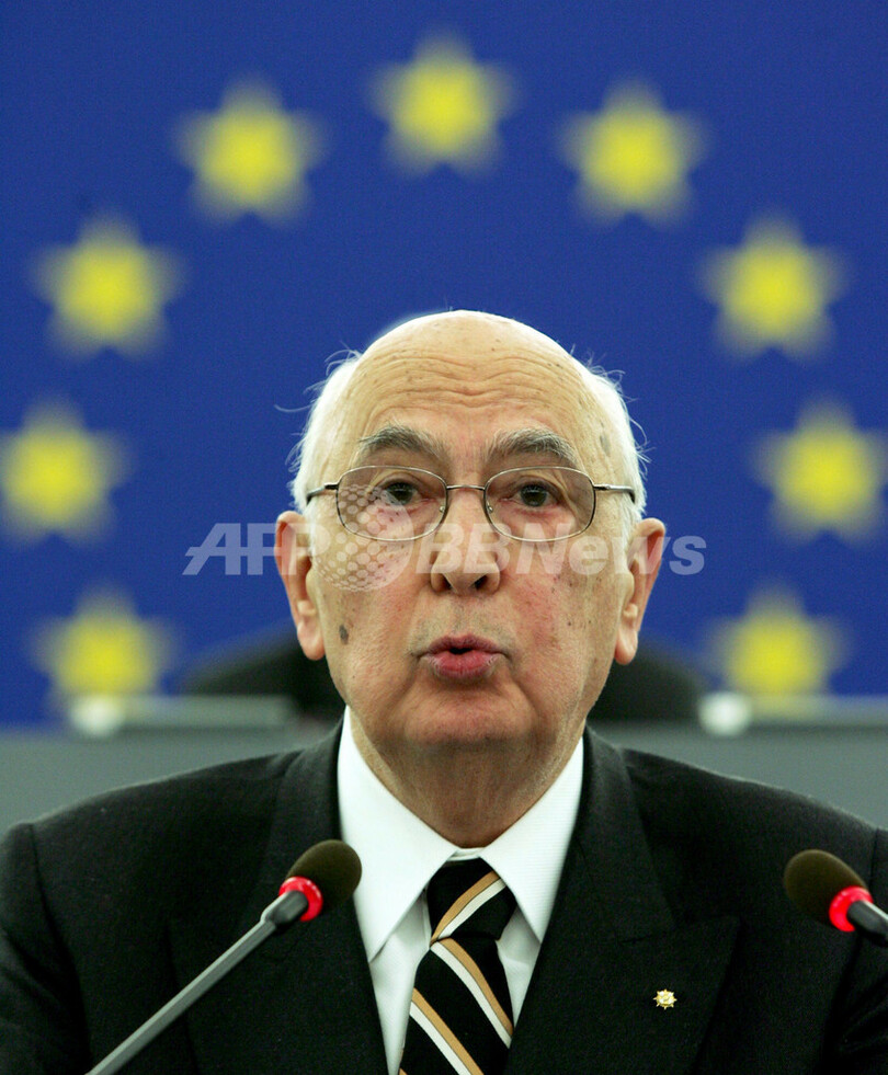 【ストラスブール/フランス 15日 AFP】欧州議会(European Parliament)のハンス・ゲルト・ポッテリング(Hans-Gert Poettering)議長は14日、縮小された欧州連合(EU)憲法草案をストラスブール(Strasbourg)で同議会に提示した。議長案には拡大したEUが機能するために必要な最低限の重要条項だけが盛り込まれている。写真は同日、ストラスブールのEU議会本会議で演説するイタリアのジョルジョ・ナポリターノ(Giorgio Napolitano)大統領。(c)AFP/GERARD CERLES