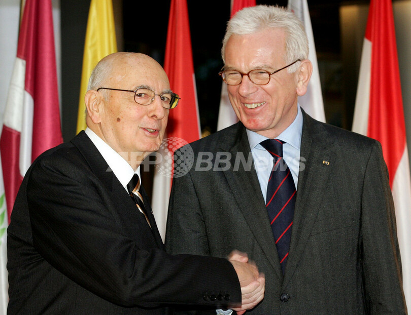 【ストラスブール/フランス 15日 AFP】欧州議会(European Parliament)のハンス・ゲルト・ポッテリング(Hans-Gert Poettering)議長は14日、縮小された欧州連合(EU)憲法草案をストラスブール(Strasbourg)で同議会に提示した。議長案には拡大したEUが機能するために必要な最低限の重要条項だけが盛り込まれている。写真は同日、ストラスブールのEU議会本会議で演説するイタリアのジョルジョ・ナポリターノ(Giorgio Napolitano)大統領。(c)AFP/GERARD CERLES
