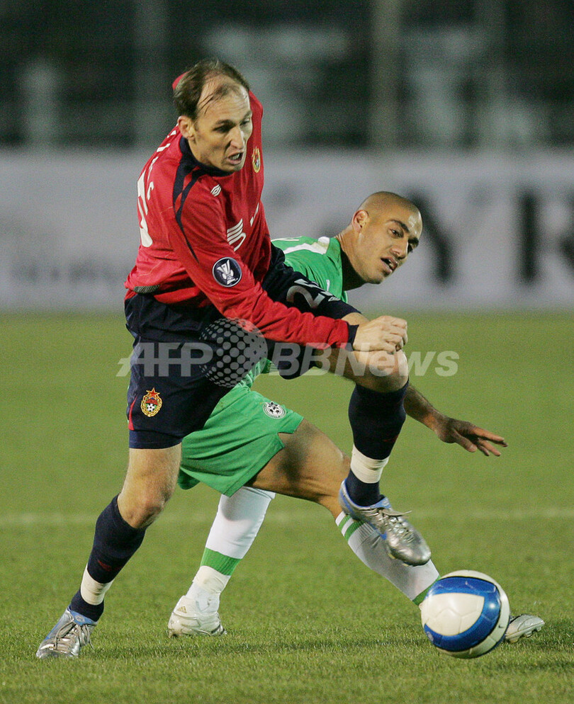 【モスクワ/ロシア 14日 AFP】サッカー、UEFA杯(UEFA Cup)・決勝トーナメント1回戦、CSKAモスクワ(CSKA Moscow)vsマッカビ・ハイファ(Maccabi Haifa)、第1戦。試合はスコアレスドローに終わった。第2戦は22日にマッカビ・ハイファのホームで行われる。写真は、マッカビ・ハイファのアッバス・スアン(Abbass Swan、右)をかわすCSKAモスクワのラモン(Ramon Osni Moreira Lage)。(c)AFP/MAXIM MARMUR