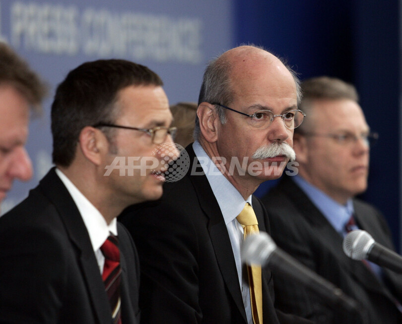 【オーバンヒルズ/米国 15日 AFP】ダイムラー・クライスラー(Daimler Chrysler)は14日、米国部門を黒字転換させる大規模再編の一環として、同社の赤字部門、クライスラーの人員1万3000人の削減計画を発表した。クライスラーの総従業員数は8万2500人だが、削減される人数はその約16%にあたる。6年前にも収益回復計画が実施され、当時は2万6000人が削減され、16の工場が閉鎖された。写真はミシガン(Michigan)州のオーバンヒルズ(Auburn Hills)で同日、記者会見に臨むディーター・ツェッチェ(Dieter Zetsche)社長(中央)と、同社首脳陣。(c)AFP/JEFF HAYNES