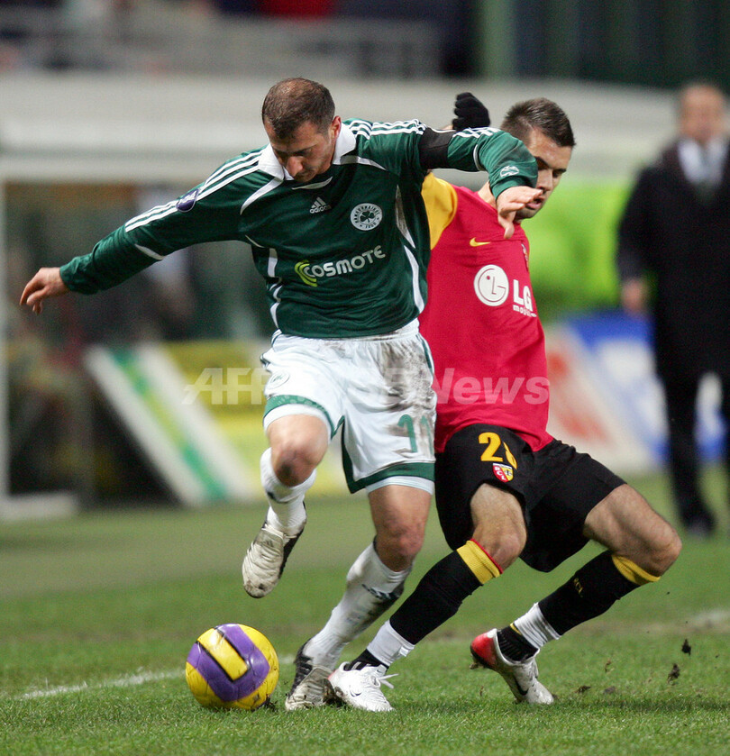 【ランス/フランス 15日 AFP】サッカー、UEFA杯(UEFA Cup)・決勝トーナメント1回戦、ランス(Lens)vsパナシナイコス(Panathinaikos)、第1戦。ランスのイサム・ジェマー(Issam Jemaa)は、この試合2ゴール(後半4分、25分)を挙げる活躍でチームの勝利に貢献した。試合はランスが3-1でパナシナイコスに先勝した。第2戦はパナシナイコスのホームで22日に行われる。写真は、ゴールを決めてチームメイトから祝福を受けるジェマー(右)。(c)AFP/DENIS CHARLET