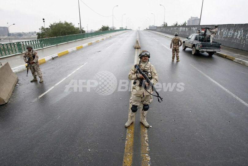 写真は同日、バグダッド中心部の検問所付近で配置に就くイラク軍部隊。(c)AFP/AHMAD AL-RUBAYE