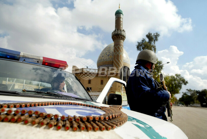 写真はバグダッド中心部で、モスクの警備にあたる警察官。(c)AFP/ALI YUSSEF