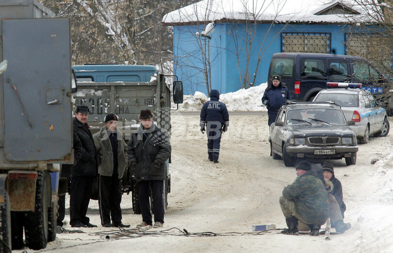 写真は感染が確認されたShikhkovo村の入口を封鎖する警察官。(c)AFP/ALEXANDER NEMENOVNEMENOV