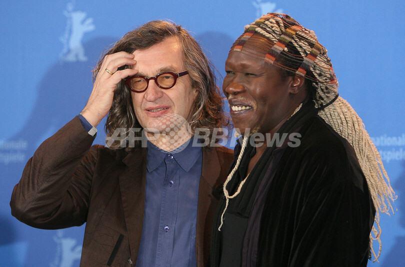 写真は、フォトコールに参加したドイツ人映画監督、ヴィム・ヴェンダース(Wim Wenders、左)とウガンダ人音楽監督のジェフリー・オリエマ(Geoffrey Oryema)。(c)AFP/JOHN MACDOUGALL