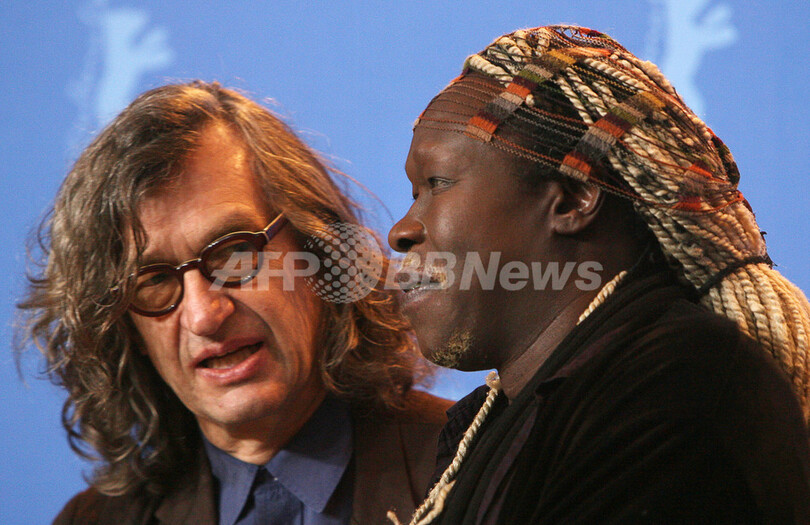 写真は、フォトコールに参加したドイツ人映画監督、ヴィム・ヴェンダース(Wim Wenders、左)とウガンダ人音楽監督のジェフリー・オリエマ(Geoffrey Oryema)。(c)AFP/JOHN MACDOUGALL