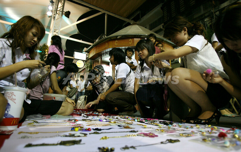【バンコク/タイ 18日 AFP】高校の制服姿でしゃがみ込み、Pheungさんが夢中で作っているのは、ビーズのキーホルダー。毎週金曜になると彼女はバンコク(Bangkok)の中心街にある市場の一角で出店を開き、1本当り約30分かけて仕上げたきらびやかな作品を1個220バーツ(約786円)で販売している。