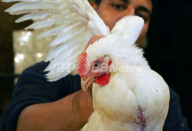 写真は、アレクサンドリア(Alexandria)の市場で鶏をみせる男性。(c)AFP/KHALED DESOUKI