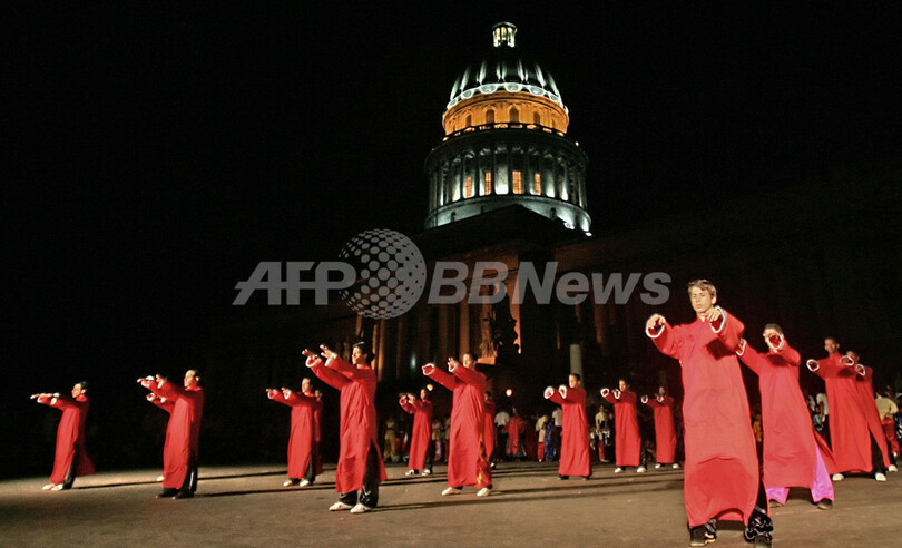 写真は17日深夜、首都ハバナの通りで、獅子舞とともに春節を祝う人々。(c)AFP/ADALBERTO ROQUE