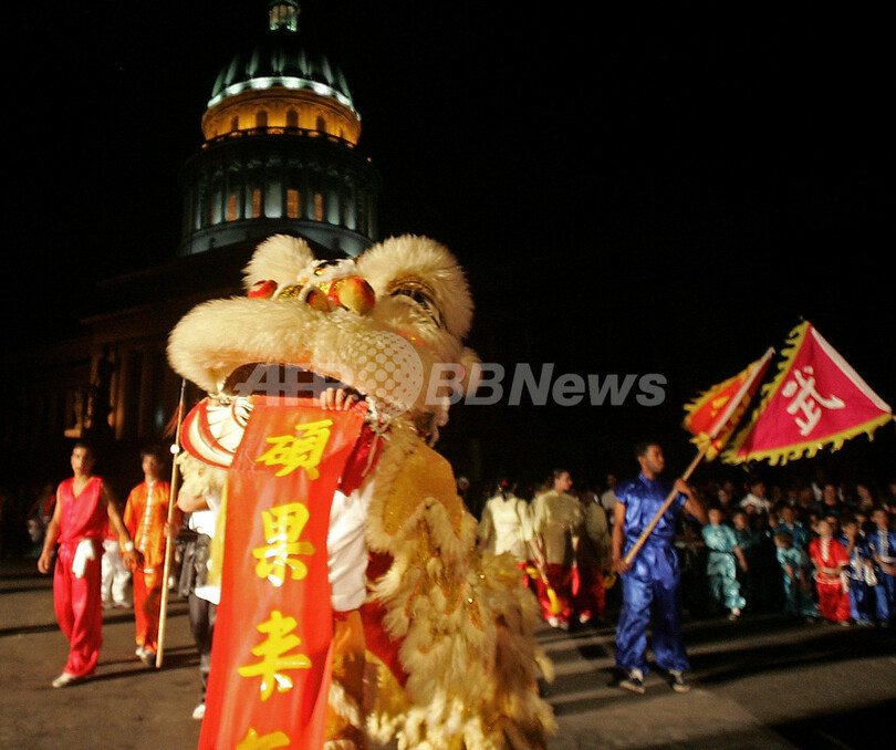 写真は17日深夜、首都ハバナの通りで、獅子舞とともに春節を祝う人々。(c)AFP/ADALBERTO ROQUE