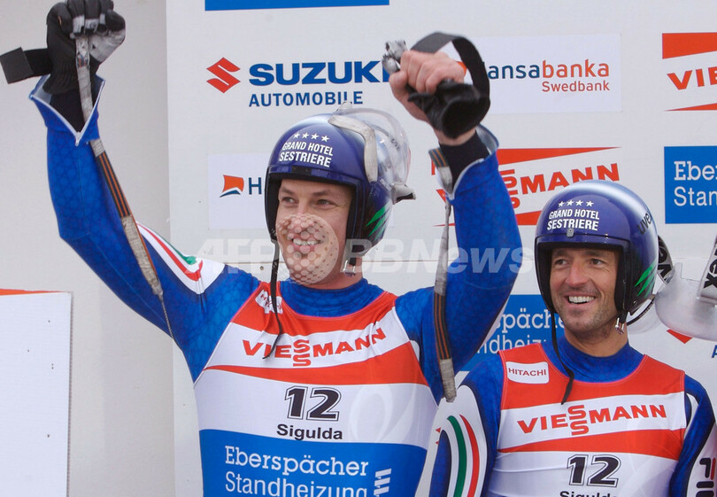 【スィグルダ/ラトビア 18日 AFP】リュージュW杯(FIL Luge World Cup)・第9戦、男子二人乗り。イタリアのゲアハルト・プランケンシュタイナー(Gerhard Plankensteiner)/オズワルト・ヘーゼルリーダー(Oswald Haselreider)組は、合計タイム1分25秒892(1本目42秒971、2本目42秒921)をマークして今季初優勝を飾った。(c)AFP/ILMARS ZNOTINS