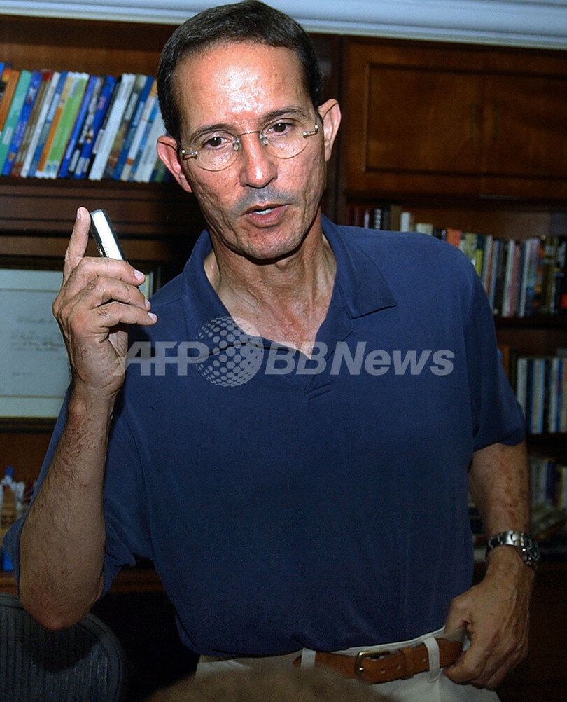 【カルタヘナ/コロンビア 20日 AFP】マリア・コンスエロ・アラウホ(Maria Consuelo Araujo)外相が19日に突然辞任したことを受け、アルバロ・ウリベ(Alvaro Uribe)大統領は同日、元閣僚のフェルナンド・アラウホ・ペルドモ(Fernando Araujo Perdomo)氏を後任に指名した。ペルドモ氏は、6年前に左派ゲリラ・コロンビア革命軍(FARC)に誘拐され、人質として拘束されていたが、前年12月31日に脱出に成功した。アラウホ前外相には、実の兄弟であるアルバロ・アラウホ(Alvaro Araujo)上院議員が右派民兵組織に資金提供を行っていた疑惑が浮上していた。写真はカルタヘナ(Cartagena)で19日、携帯電話で話すペルドモ氏。(c)AFP
