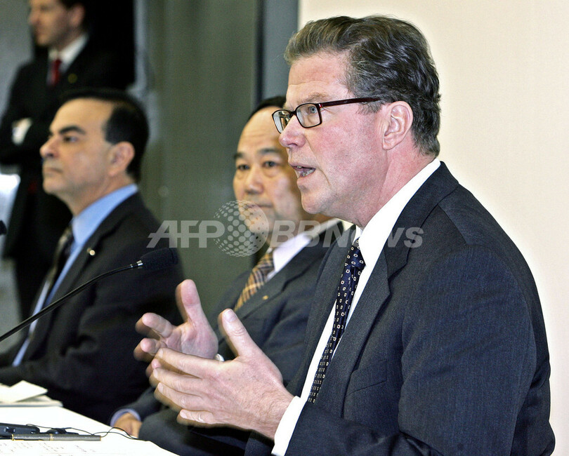 写真は日産自動車本社で、同社保有の日産ディーゼル株売却について開かれた記者会見時のボルボのリーフ・ヨハンソン(Leif Johansson)社長兼CEO(右)、カルロス・ゴーン(Carlos Ghosn)日産自動車社長(左)、仲村巌日産ディーゼル工業社長(2006年3月21日撮影)。(c)AFP/YOSHIKAZU TSUNO