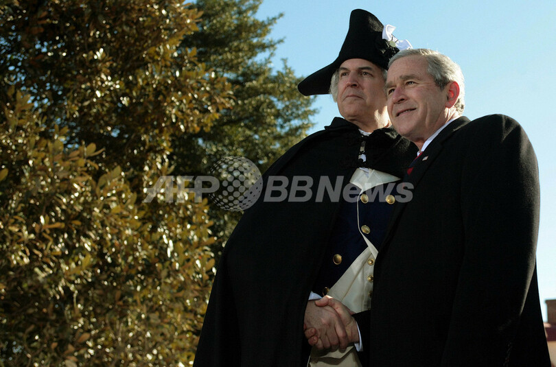 写真はジョージ・ワシントン生誕から275年目にあたる「大統領の日」の19日、マウントバーモンでワシントンに扮する俳優ディーン・マリッサ(Dean Malissa)氏(左)と握手をするブッシュ大統領。(c)AFP/Jim WATSON