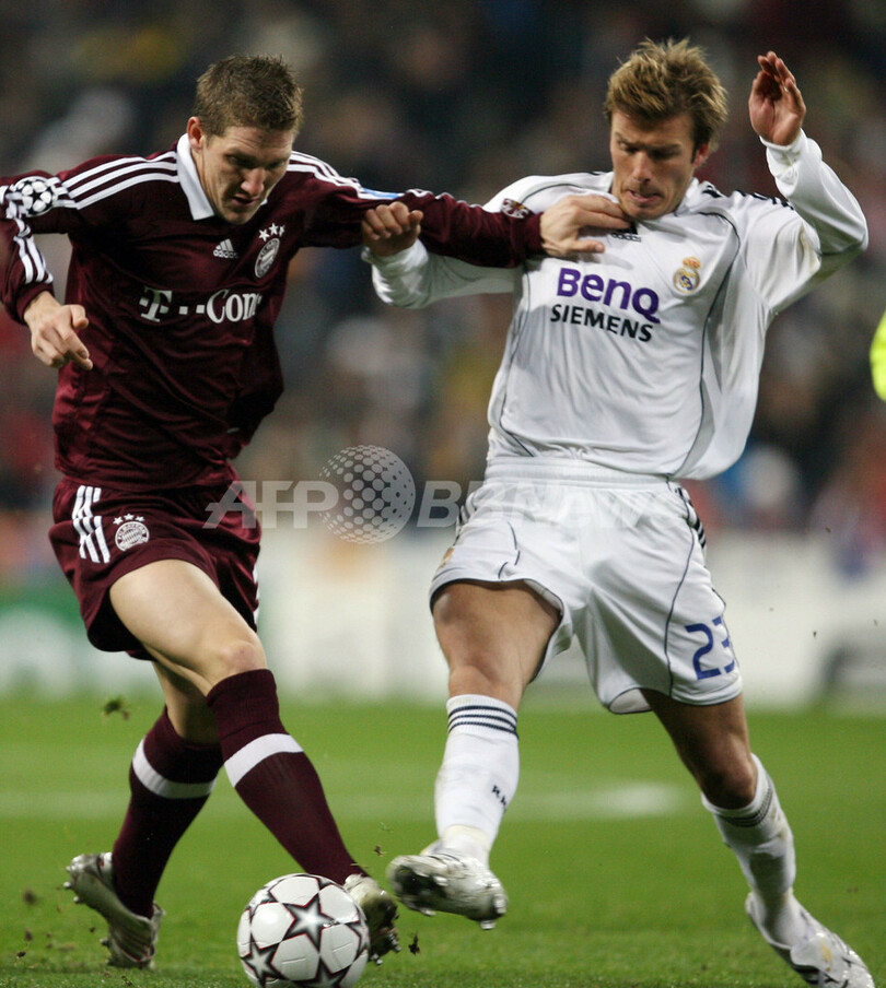 【マドリード/スペイン 20日 AFP】サッカー、欧州チャンピオンズリーグ(Champions League)・決勝トーナメント1回戦、レアル・マドリード(Real Madrid)vsバイエルン・ミュンヘン(Bayern Munich)、第1戦。試合はレアル・マドリードがラウル・ゴンザレス(Raul Gonzalez)の2ゴール(前半10分、28分)などでバイエルンに3-2で競り勝った。写真は、バイエルンのバスティアン・シュバインシュタイガー(Bastian Schweinsteiger)とボールを競るレアル・マドリードのデビッド・ベッカム(David Beckham、右)。(c)AFP/JAVIER SORIANO