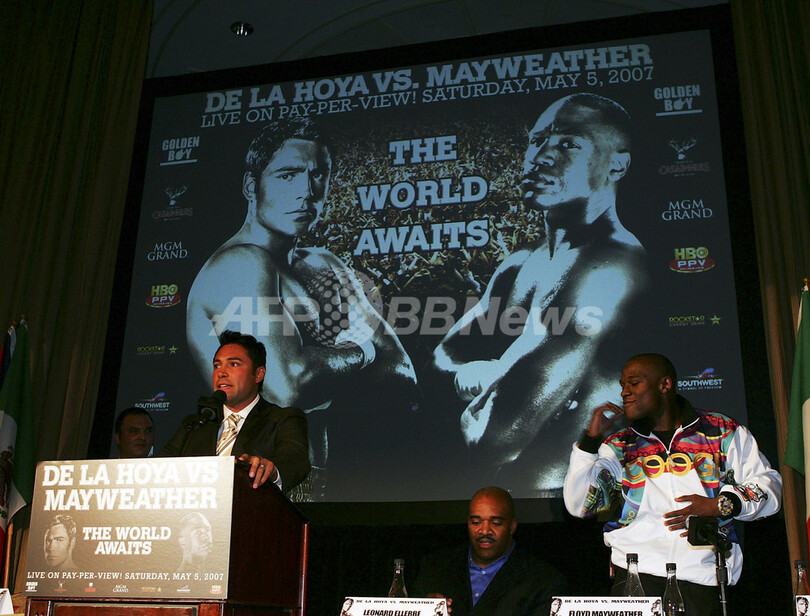 【ニューヨーク/米国 20日 AFP】ボクシング、WBC世界スーパーウェルター級タイトルマッチを5月5日に控える同級王者のオスカー・デラホーヤ(Oscar De La Hoya、米国)は、挑戦者のフロイド・メイウェザー・ジュニア(Floyd Mayweather Jr.、米国)と共にニューヨークのウォルドルフ・アストリア・ホテル(Waldof Astoria Hotel)で開かれた記者会見に出席した。写真は、会見場で睨み合うデラホーヤ(左)とメイウェザー・ジュニア。(c)AFP/DON EMMERT