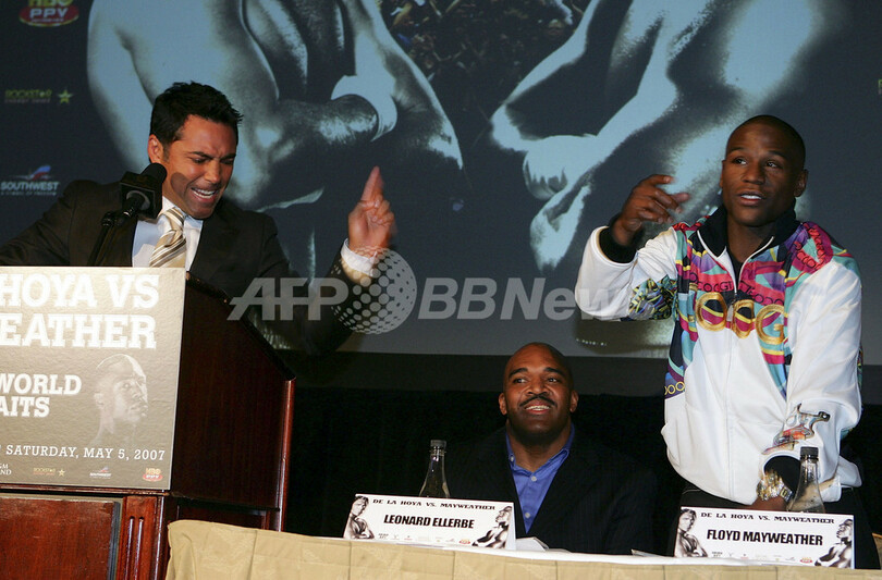 【ニューヨーク/米国 20日 AFP】ボクシング、WBC世界スーパーウェルター級タイトルマッチを5月5日に控える同級王者のオスカー・デラホーヤ(Oscar De La Hoya、米国)は、挑戦者のフロイド・メイウェザー・ジュニア(Floyd Mayweather Jr.、米国)と共にニューヨークのウォルドルフ・アストリア・ホテル(Waldof Astoria Hotel)で開かれた記者会見に出席した。写真は、会見場で睨み合うデラホーヤ(左)とメイウェザー・ジュニア。(c)AFP/DON EMMERT