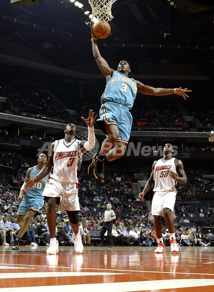 【シャーロット/米国 20日 AFP】06-07NBA、シャーロット・ボブキャッツ(Charlotte Bobcats)vsニューオーリンズ/オクラホマシティ・ホーネッツ(New Orleans/Oklahoma City Hornets)。ホーネッツのタイソン・チャンドラー(Tyson Chandler、中央)は、両チーム最多の20リバウンドに加え16得点を挙げるもチームを勝利に導くことはできなかった。試合は、100-104でホーネッツが敗れ、今季29敗目を喫した。(c)AFP/Getty Images/NBAE Kent Smith