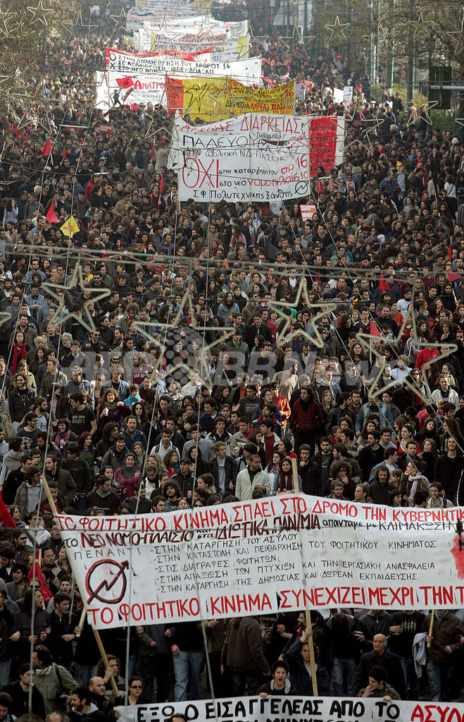 ニュース 政治・経済 政府の高等教育改革案に対する抗議行動、7週間目に突入 - ギリシャ 2007年2月23日 2:04 発信地:ギリシャ [ ヨーロッパ ギリシャ ] このニュースをシェア ‹ › ❮ 2/2 ❯ 写真は同日、アテネ市街をデモ行進する学生たち。(c)AFP/LOUISA GOULIAMAKI 画像作成中 ! 【アテネ/ギリシャ 23日 AFP】首都アテネでは22日、政府当局が打ち出した高等教育改革案に反対する数千人の大学生たちが抗議デモを実施し、機動隊と衝突した。学生らの抗議活動は7週間目に突入する。機動隊は催涙弾の使用に踏み切っている。写真は同日、棒を手に機動隊と対峙(たいじ)する学生たち。(c)AFP/LOUISA GOULIAMAKI 政治・経済 一覧へ> メディア・報道関係・法人の方向け 写真・動画 購入のお問合せ>