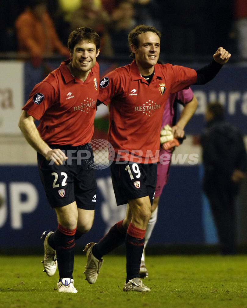 【パンプロナ/スペイン 22日 AFP】サッカー、UEFA杯(UEFA Cup)・決勝トーナメント1回戦、オサスナ(CA Osasuna)vsボルドー(Bordeaux)、第2戦。2試合連続のスコアレスドローに終わった為に延長戦にまでもつれ込んだ試合はオサスナが1-0でボルドーを降し、決勝トーナメント2回戦へ駒を進めた。写真は、チームメイトのエンリケ・コラレス(Enrique Corrales、右)と勝利を喜ぶオサスナのイニャキ・ムノス(Inaki Munoz、左)。(c)AFP/A. ARRIZURIETA