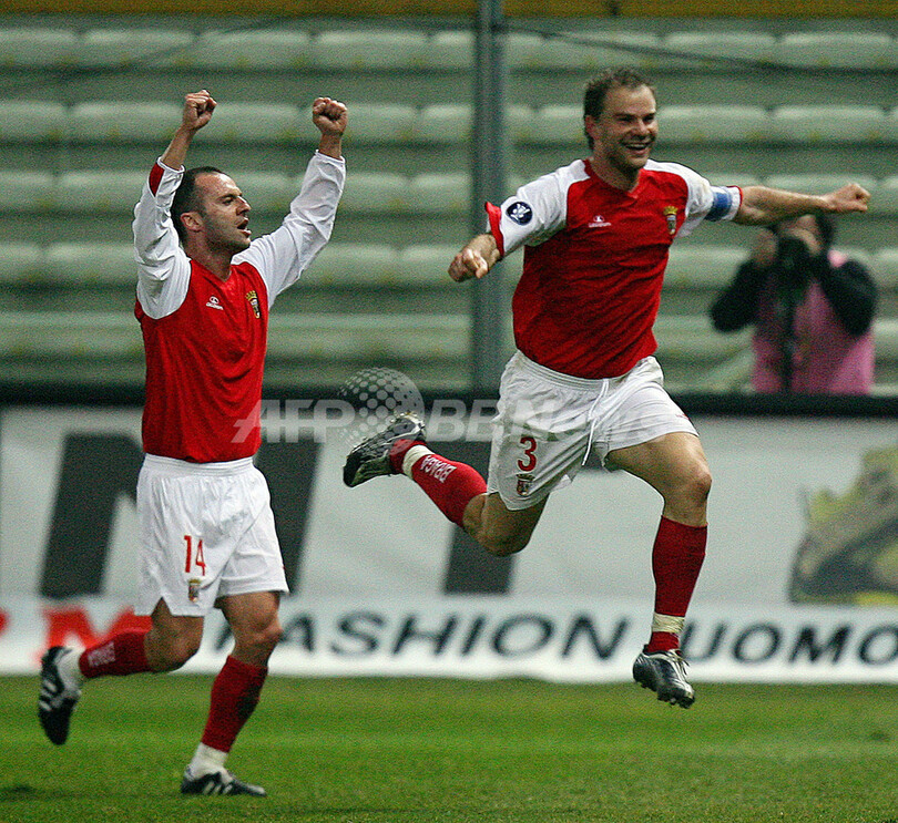 【パルマ/イタリア 22日 AFP】サッカー、UEFA杯(UEFA Cup)・決勝トーナメント1回戦、パルマ(Parma)vsSCブラガ(SC Braga)、第2戦。ブラガのパウロ・ジョルジェ(Paulo Jorge)は、後半44分に決勝点となるゴールを決めチームの勝利に貢献した。試合はブラガが1-0で勝利を収め、2戦合計スコアを2-0として決勝トーナメント2回戦進出を決めた。写真は、決勝ゴールを決め喜ぶジョルジェ(右)。(c)AFP/PACO SERINELLI