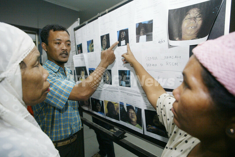 写真は23日、ジャカルタで犠牲者の写真で家族の身元を確認する市民。(c)AFP/AHMAD