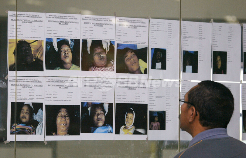 写真は23日、ジャカルタで犠牲者の写真で家族の身元を確認する市民。(c)AFP/AHMAD