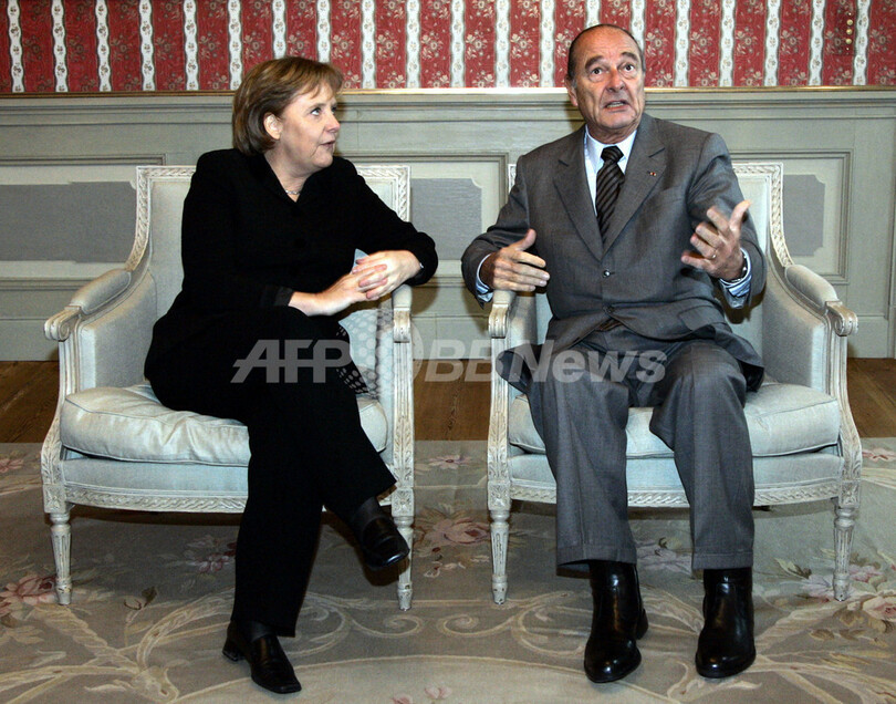 写真はMESEBERGで同日、非公式会談に臨むメルケル首相(左)とシラク大統領。(c)AFP/MARCUS BRANDT