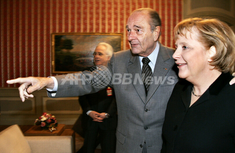 写真はMESEBERGで同日、非公式会談に臨むメルケル首相(左)とシラク大統領。(c)AFP/MARCUS BRANDT