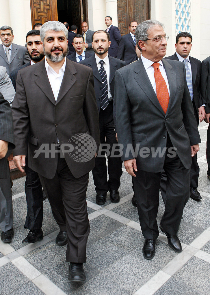 写真は22日、カイロでアムル・マハムード・ムーサ(Amr Mahmoud Moussa)アラブ連盟(Arab League)事務局長(中央右)との共同記者会見を終えたメシャール氏(中央左)。(c)AFP/KHALED DESOUKI