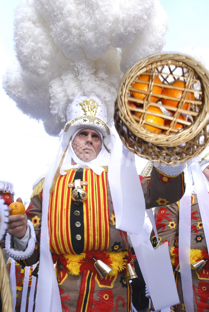 【バンシュ/ベルギー 24日 AFP】ベルギー伝統のお祭り「バンシュ・カーニバル(Binche Carnival)」が18日から20日まで開催された。ベルギーのバンシュ(Binche)で開催。写真は、マルディ・グラの日(Mardis Gras Day、20日)の早朝に、伝承的な衣装をまといバンシュの通りを踊りながらパレードをする「バンシュのジル(道化師、Gilles de Binche)」たち。(c)AFP/Belga Bruno Arnold