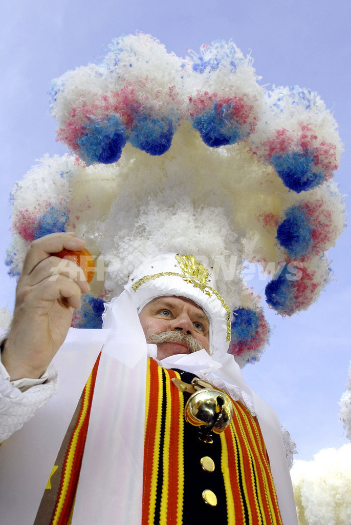 【バンシュ/ベルギー 24日 AFP】ベルギー伝統のお祭り「バンシュ・カーニバル(Binche Carnival)」が18日から20日まで開催された。ベルギーのバンシュ(Binche)で開催。写真は、マルディ・グラの日(Mardis Gras Day、20日)の早朝に、伝承的な衣装をまといバンシュの通りを踊りながらパレードをする「バンシュのジル(道化師、Gilles de Binche)」たち。(c)AFP/Belga Bruno Arnold