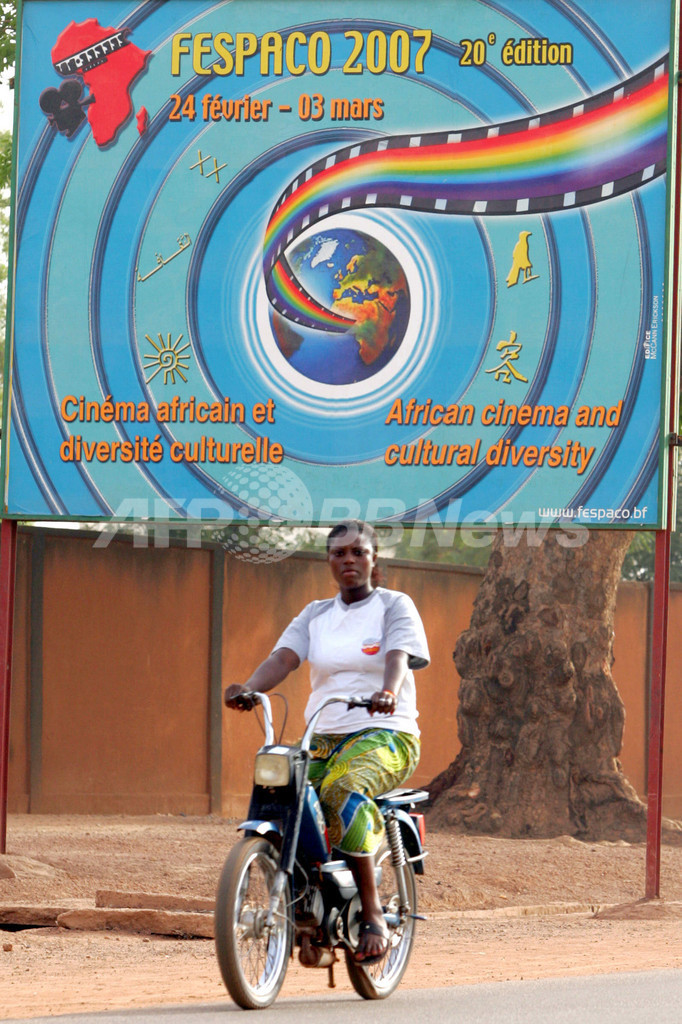 【ワガドゥグ/ブルキナファソ 24日 AFP】アフリカ最大規模の映画の祭典「汎アフリカ映画テレビ祭(Panafrican Film and Television Festival of Ouagadougou、通称:FESPACO)」が2月24日から3月3日まで開催される。2年に1度開催される同映画祭は今回で20回目を迎える。アフリカ大陸の不調な映画産業を活気付けるべく、同大陸の映画はもちろんのこと、国外に移住したアフリカ系の人々が製作した作品など3千本以上が出品される予定。写真は23日、ワガドゥグの通りに掲げられた同映画祭の公式ポスター。(c)AFP/ISSOUF SANOGO