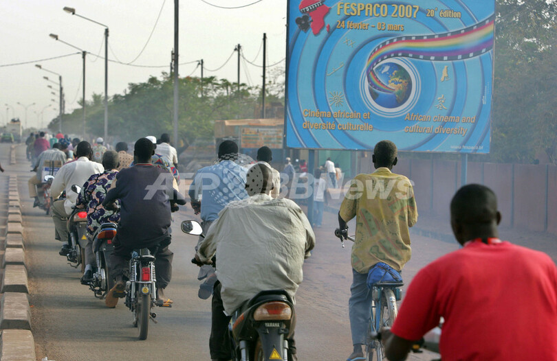 【ワガドゥグ/ブルキナファソ 24日 AFP】アフリカ最大規模の映画の祭典「汎アフリカ映画テレビ祭(Panafrican Film and Television Festival of Ouagadougou、通称:FESPACO)」が2月24日から3月3日まで開催される。2年に1度開催される同映画祭は今回で20回目を迎える。アフリカ大陸の不調な映画産業を活気付けるべく、同大陸の映画はもちろんのこと、国外に移住したアフリカ系の人々が製作した作品など3千本以上が出品される予定。写真は23日、ワガドゥグの通りに掲げられた同映画祭の公式ポスター。(c)AFP/ISSOUF SANOGO
