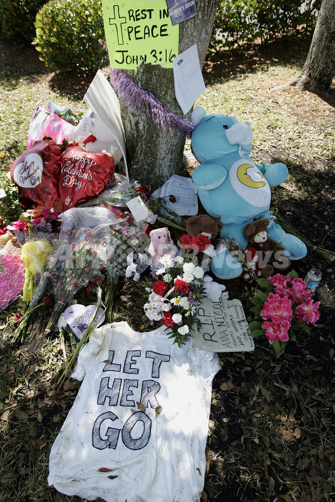 【フロリダ/米国 24日 AFP】2月8日に急逝した元プレイメイトで石油王の未亡人だったアンナ・ニコル・スミス(Anna Nicole Smith)さんの遺体をめぐって争われていた訴訟で22日、判事はスミスさんの遺体をバハマに埋葬する判決を下し、両弁護士はこれに同意した。しかし娘を故郷テキサスに埋葬したいと考えているスミスさんの母親は控訴を申し立てるつもりだという。写真はスミスさんの遺体が眠るフロリダの死体公示所近くに作られた故人を偲ぶメモリアル。(c)AFP/ROBERT SULLIVAN