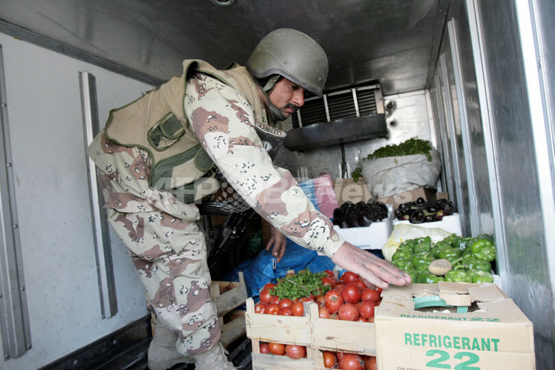 写真は同日、バグダッド市内の中心部のチェックポイントで、野菜を積んだトラックを検査するイラク軍兵士。(c)AFP/ALI AL-SAADI