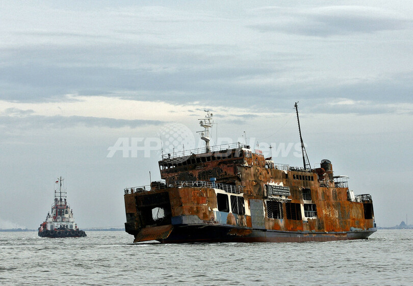 【ジャカルタ/インドネシア 24日 AFP】ジャカルタ(Jakarta)沖で22日発生の乗員乗客300人以上を乗せたフェリー火災で、軍の報道官は23日、新たに2人の犠牲者の遺体が発見されたと発表した。現時点での犠牲者総数は18人となった。すでに約200人の救助は完了しており、そのほとんどが海に飛び込んだ人々であるが、依然として120人近くが行方不明のままであり、火災が発生した船内に取り残された恐れもある。写真は24日、フェリー「Levina I」をけん引するタグボート。(c)AFP/ADEK BERRY