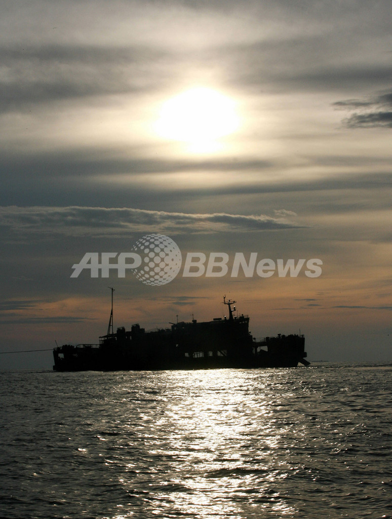 【ジャカルタ/インドネシア 24日 AFP】ジャカルタ(Jakarta)沖で22日発生の乗員乗客300人以上を乗せたフェリー火災で、軍の報道官は23日、新たに2人の犠牲者の遺体が発見されたと発表した。現時点での犠牲者総数は18人となった。すでに約200人の救助は完了しており、そのほとんどが海に飛び込んだ人々であるが、依然として120人近くが行方不明のままであり、火災が発生した船内に取り残された恐れもある。写真は24日、フェリー「Levina I」をけん引するタグボート。(c)AFP/ADEK BERRY