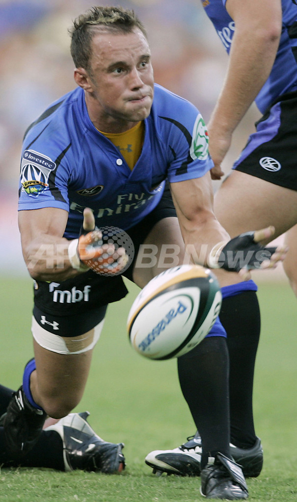 【パース/オーストラリア 24日 AFP】ラグビー、2007スーパー14・第4節、ウェスタン・フォース(Western Force、オーストラリア)vsライオンズ(Lions、南アフリカ)。ウェスタン・フォースは24-25で競り負け、通算成績を2勝2敗とした。写真は、チームメイトにパスを出すウェスタン・フォースのマット・ヘンジャック(Matt Henjak)。(c)AFP/Tony ASHBY