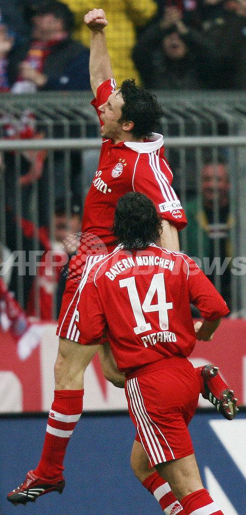 【ミュンヘン/ドイツ 24日 AFP】サッカー、ドイツ・ブンデスリーガ・第23節、バイエルン・ミュンヘン(Bayern Munich)vsVfLボルフスブルク(VfL Wolfsburg)。バイエルンのマルク・ファン・ボメル(Mark Van Bommel)は、後半11分にチーム2点目のゴールを決めて第9節以来となるシーズン4得点をマークする。試合はこのゴールが決勝点となりバイエルンが2-1で勝利を収め、シーズン12勝目を挙げて勝ち点を40に伸ばした。写真は、手を叩いてサポーターに感謝を表すファン・ボメル。(c)AFP/OLIVER LANG