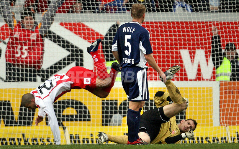 【マインツ/ドイツ 24日 AFP】サッカー、ドイツ・ブンデスリーガ・第23節、マインツ05(Mainz 05)vsニュルンベルク(Nuremberg)。マインツのモハメド・ジダン(Mohamed Zidan)は、チーム全得点となる2ゴール(前半20分、同27分)を挙げ3試合連続ゴールを達成する。試合はマインツが2-1でニュルンベルクを降し、3連勝を飾りシーズン6勝目を挙げた。写真は、チームメイトから祝福を受けるジダン(中央)。(c)AFP/THOMAS LOHNES