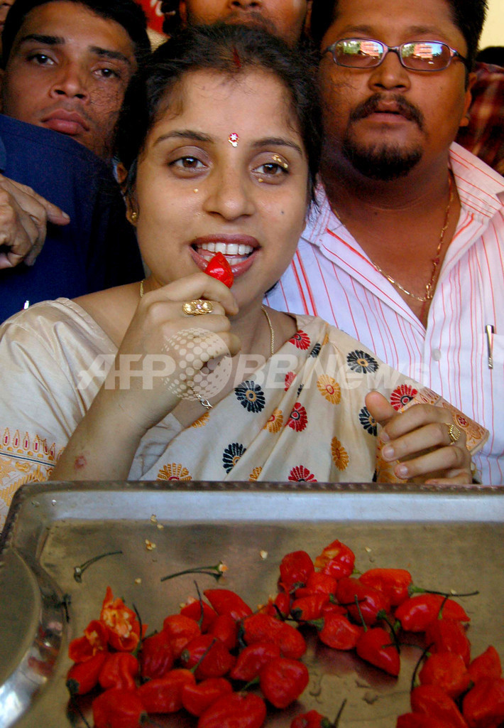 【グワハティ/インド 25日 AFP】地元アッサム地方で「ghost chili(お化け唐辛子)」の異名を持つギネス世界一の激辛唐辛子「ブート・ジョロキア(Bhut Jolokia)」の大食い記録に、インド北東部出身のAnnandita Dutta Tamulyさん(26)が挑戦する。Tamulyさんは記録挑戦のためギネス協会から招待を受け、記録挑戦のためロンドンへと向かう。写真はアッサム州グワハティ(Guwahati)で25日、テレビ番組内で「ブート・ジョロキア(Bhut Jolokia)」の大食いに挑戦するTamulyさん。(c)AFP