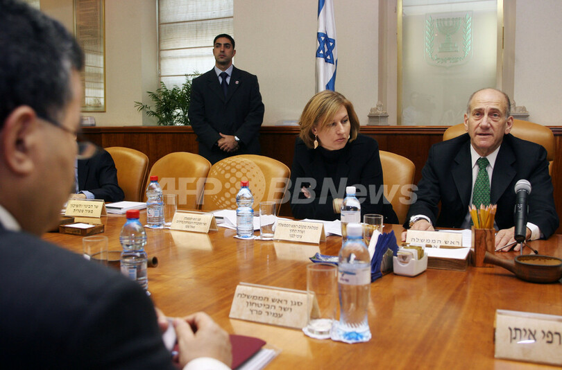 【エルサレム/イスラエル 25日 AFP】イスラエルの閣僚らは25日、パレスチナとの紛争やイラン、シリアとの問題についてまとめた情報機関の報告書を受けて閣僚会議を行なう。同会議には「様々な情報機関からの、2006年から2007年までの報告書が提出される」とエフド・オルメルト(Ehud Olmert)首相の報道官、Miri Eisin氏は述べた。写真はエルサレム(Jerusalem)の首相府で25日、集まった閣僚らを見渡すオルメルト首相。(c)AFP/JIM HOLLANDER