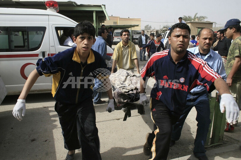【バグダッド/イラク 25日 AFP】バグダッド東部の大学で25日、自爆テロが発生し少なくとも40人が死亡、35人が負傷した。治安当局が伝えた。近郊の病院の広報担当によると、School of Economy and Administrationで起きた爆発による犠牲者の多くは同校に通う学生たちで、その約半分は女子学生だったという。同校は、名門Mustansiriyah Universityの付属校で、シーア(Shiite)派住民居住区のサドルシティー(Sadr City)近郊にあるメインキャンパスの北方数キロメートルに位置している。当日は、中間休みのため、登校していた学生たちの数は普段よりも少なかった。写真はサドルシティーで同日、病院の霊安室へ遺体を運び込む病院関係者。(c)AFP/WISSAM AL-OKAILI