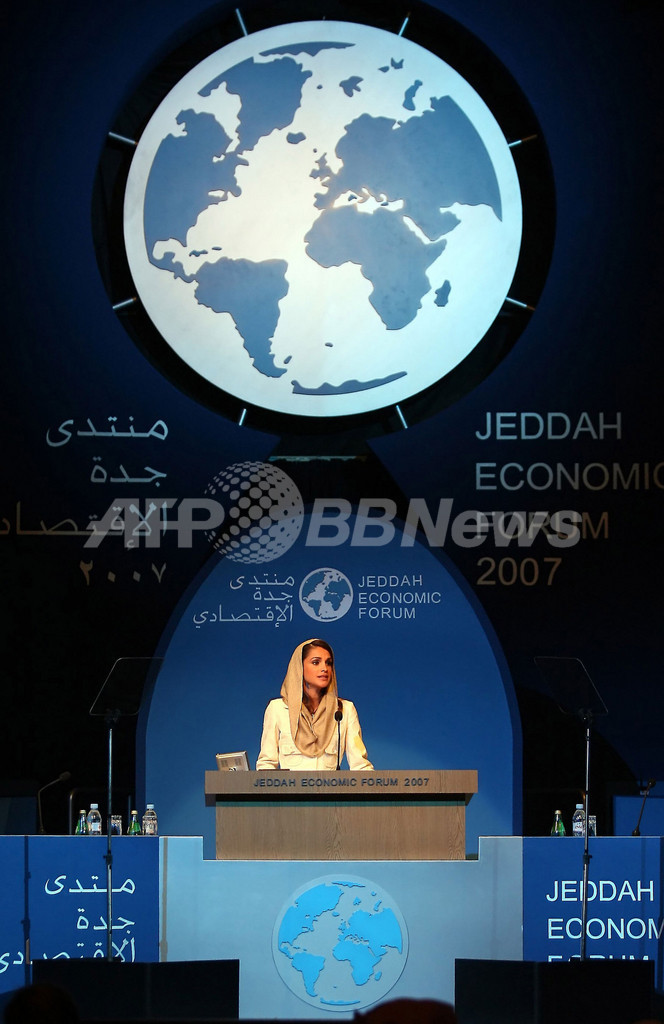 【ジッダ/サウジアラビア 26日 AFP】紅海沿岸の都市ジッダ(Jeddah)で25日、ジッダ経済フォーラム(Jeddah Economic Forum)が開かれた。同フォーラムは「中東のシンクタンク」を提唱し、1999年の初開催以来毎年開催されている。主催国サウジアラビアを始め各国から政治、経済、社会各界の要人が集い、基調講演と討論を行う。写真は25日、講演するヨルダンのラニア王妃(Queen Rania al-Abdullah)。(c)AFP/HASSAN AMMAR