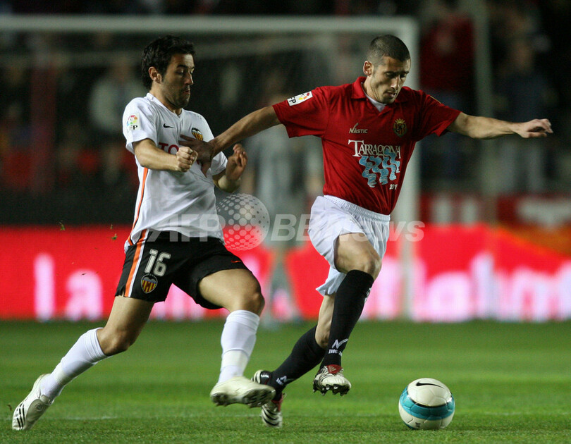 【タラゴナ/スペイン 25日 AFP】サッカー、スペイン・リーガエスパニョーラ1部・第24節、ヒムナスティク(Gimnastic)vsバレンシア(Valencia)。試合は1-1の引き分けに終わり両チーム共に勝ち点1を分け合った。写真は、ヒムナスティクのミンゴ(Carles Domingo Pladevall)とボールを競り合うバレンシアのホアキン(Joaquin、左)。(c)AFP/LLUIS GENE
