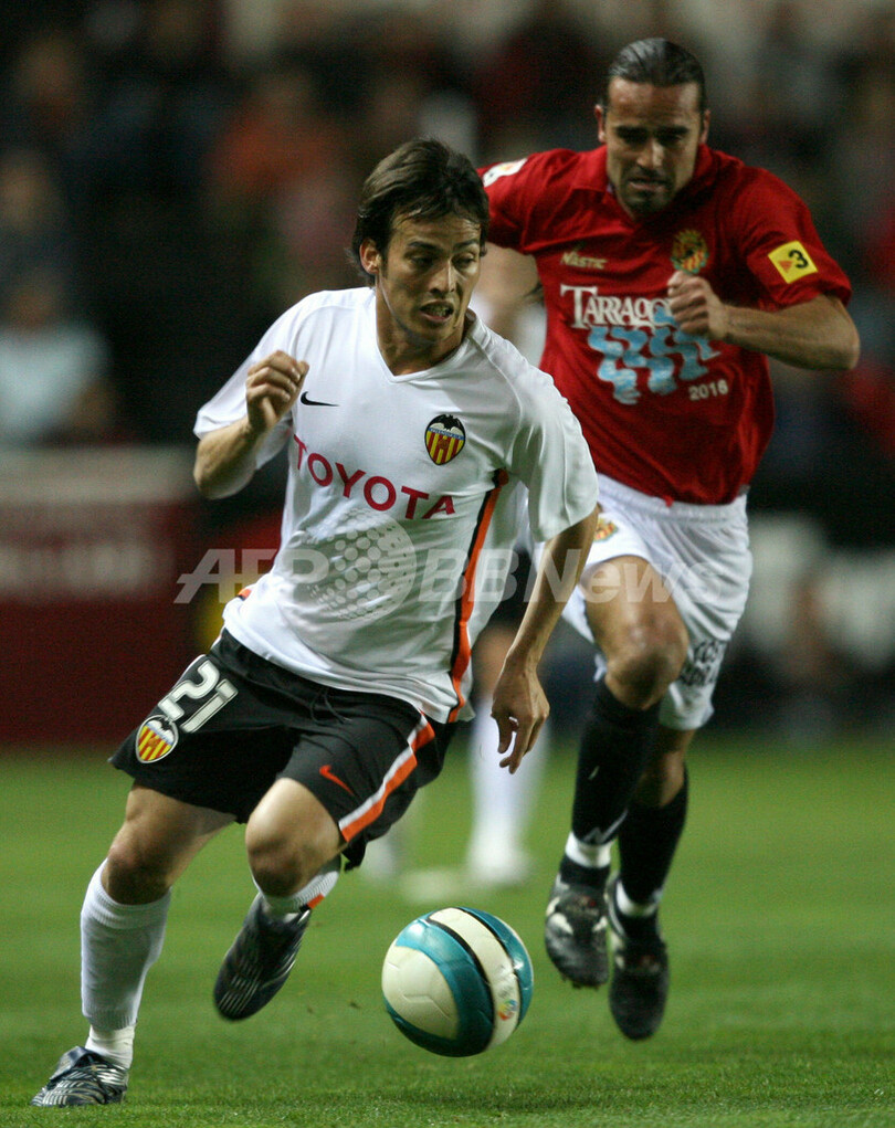 【タラゴナ/スペイン 25日 AFP】サッカー、スペイン・リーガエスパニョーラ1部・第24節、ヒムナスティク(Gimnastic)vsバレンシア(Valencia)。試合は1-1の引き分けに終わり両チーム共に勝ち点1を分け合った。写真は、ヒムナスティクのミンゴ(Carles Domingo Pladevall)とボールを競り合うバレンシアのホアキン(Joaquin、左)。(c)AFP/LLUIS GENE