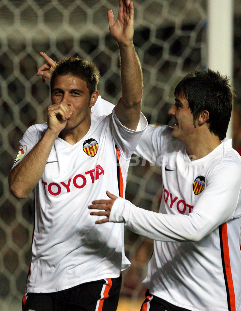 【タラゴナ/スペイン 25日 AFP】サッカー、スペイン・リーガエスパニョーラ1部・第24節、ヒムナスティク(Gimnastic)vsバレンシア(Valencia)。試合は1-1の引き分けに終わり両チーム共に勝ち点1を分け合った。写真は、ヒムナスティクのミンゴ(Carles Domingo Pladevall)とボールを競り合うバレンシアのホアキン(Joaquin、左)。(c)AFP/LLUIS GENE